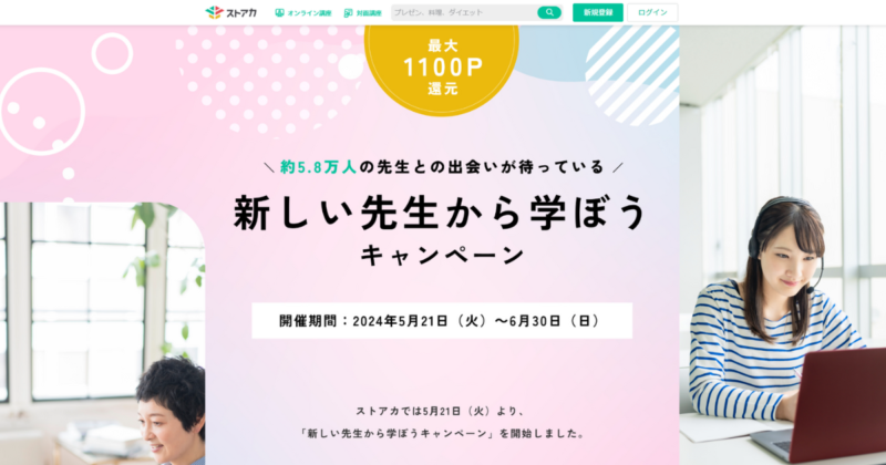 ストアカ キャンペーン【最大1,100円分ポイント還元】新しい先生から学ぼう!