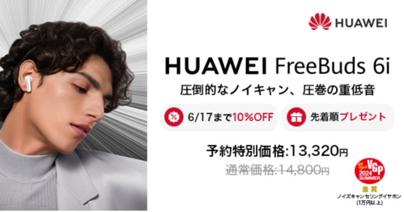 HUAWEI FreeBuds 6i 予約購入キャンペーン【10%OFF&先着プレゼント】6/17まで
