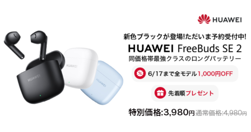 HUAWEI FreeBuds SE 2 ブラック新登場キャンペーン【1,000円OFF&先着プレゼント】6/17まで